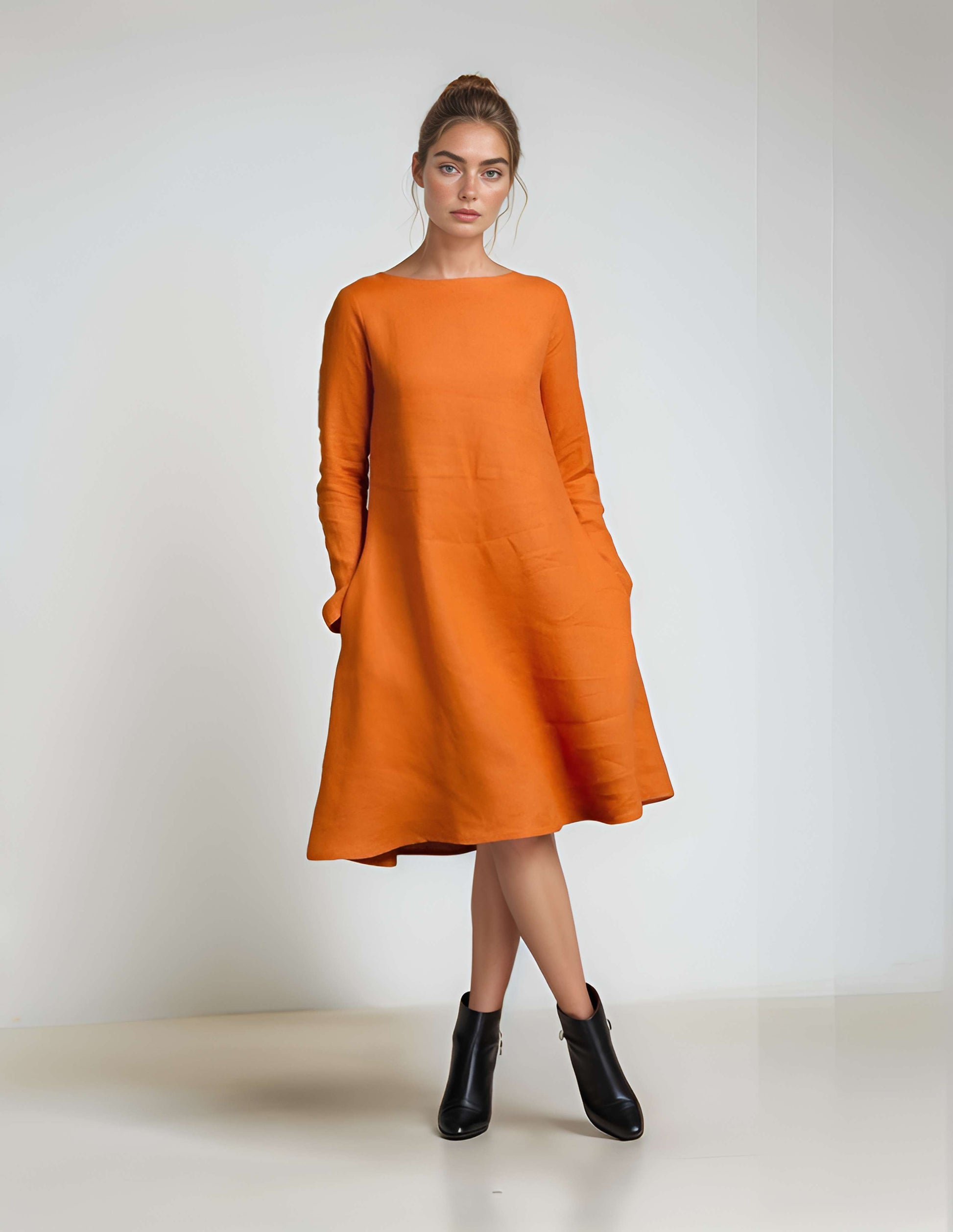 Cozy up in this long sleeve linen dress, inspired by Lille's intricate canals, where weaving waterways shape its wide trapeze silhouette and pocketed design. Long sleeves provide light coverage, ideal for transitional weather or plus-size comfort, with pockets for utility.